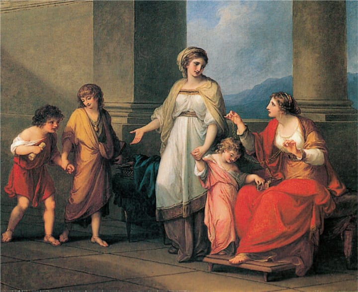 Swiss artist Angelica Kauffman created artworks depicting figures from the period in Austria. Among her most famous paintings is this one completed in 1785. It depicts a woman named Cornelia, who was the mother of the esteemed Roman leaders Tiberius and Gaius Gracchus. According to legend when a woman met Cornelia and asked to see her most prized treasures, she pointed to her children, who when grown became the future rulers of Rome.