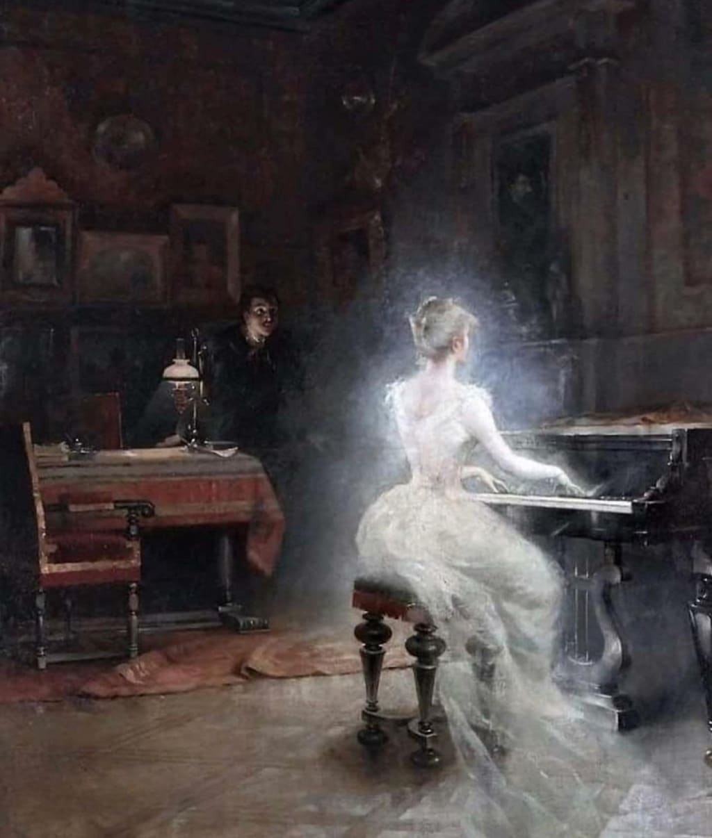 French artist George Roux created this artwork in the 19th century. In the painting he captures a ghostly woman who blends into her surroundings. The artist uses soft whites and translucent shades to give the figure an ethereal quality, making her appear suspended between this world and the next. The scene reflects loss and longing which were prevalent in the Romantic era. The ghostly spirit at the piano must be playing a haunting melody.