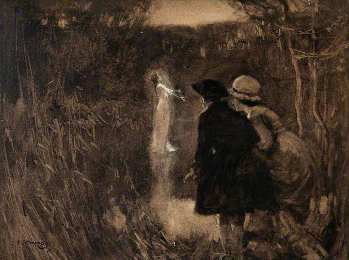 English artist Alfred James Munnings depicts a ghostly spirit in a farmhouse in Exmoor. The ghostly figure appears to glow within the shadowy room creating an eerie, candlelit atmosphere. The spirit has frightened both the woman in the bed and the man who is trying to reach out to touch the spirit probably to see if it is real. The room with its heavy wooden furniture and flickering light cast spooky long shadows and contrasts with the ghostly presence.