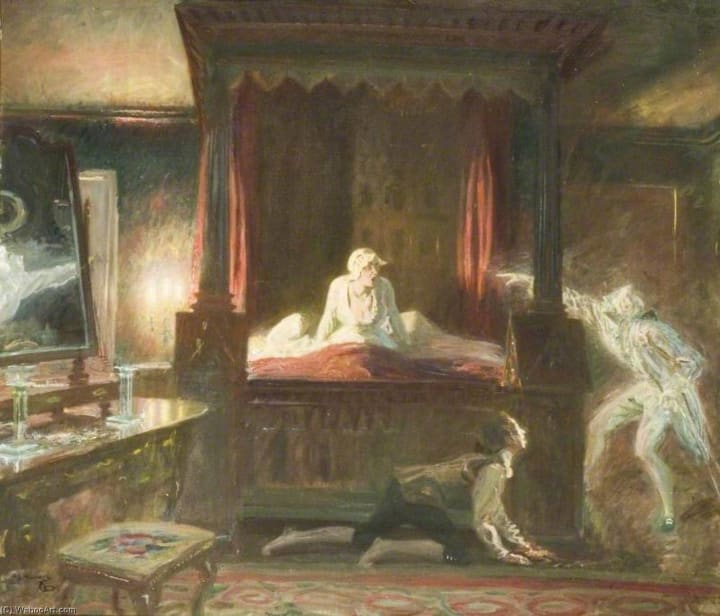English artist Sir John Everett Millais created this artwork in 1895 depicting a man sitting up in bed, reaching toward a spectral figure of woman standing by his bed.