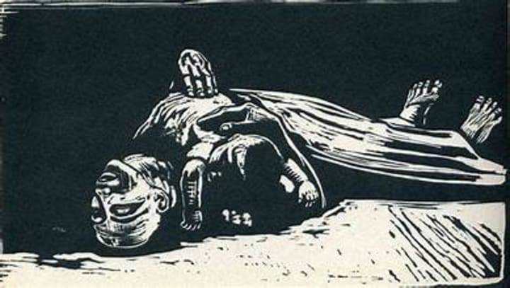 German artist Kathe Kollwitz one of the leading artists of the early 20th century creates this artwork as part of her series Krieg or War. It was made about the horrors of WW I. In this 1992 painting one can see a woman cradling her baby in death.