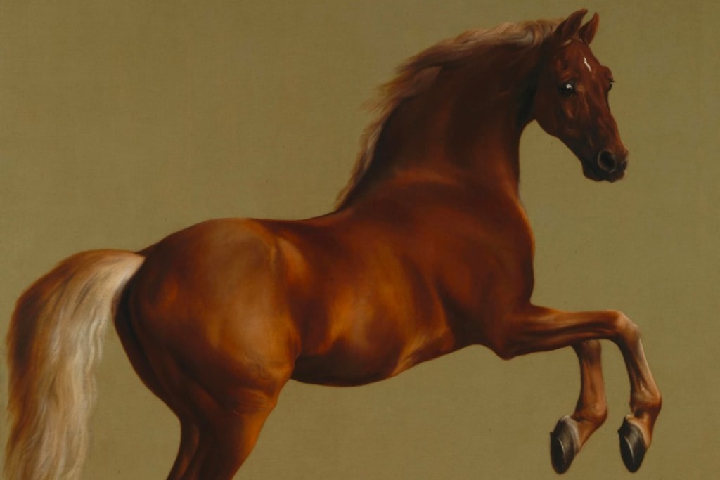 English artist George Stubbs was known for his artwork depicting horses. This painting is his most popular work and among the most famous horse paintings ever created. The horse in the artwork was a prized racehorse owned by the Marquess of Rockingham.
