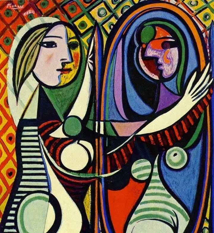 Girl Before a Mirror was created in 1932 as an oil-on-canvas depicting Picasso’s mistress and muse, Marie-Therese Walter. The artist painted her many times, and the artworks were the first public exhibition of their secret romance during his marriage to Olga Khokhlova. At this time Picasso was 50 and had established himself as a significant artist. This painting is a photograph of a woman gazing in a mirror, revealing a darker reflection of herself with her face split in two parts—one painted in a peaceful lilac color and the other a vibrant yellow.