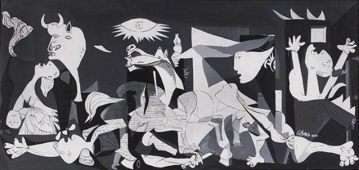 The painting Guernica was created by Picasso due to the fact that the horrors of the Spanish Civil War greatly affected him. The war began on July 17, 1936, when General Francisco led a military coup against the Spanish republic. Picasso visited Barcelona and saw the widespread destruction from heavy fighting. To show his anger, he created this artwork of the bombing of Guernica, a Basque country town in northern Spain. He completed the painting in 1937, and it became one of his most famous artworks, depicting the horrors of war.