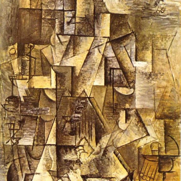 Created in 1911, Ma Jolie depicts Picasso’s girlfriend Marcette Humbert. The name of the painting means “my beautiful one,” which was a reference to a famous music hall song popular at that time. As one can see by the artwork, the primary image fades into the depths of abstract surfaces, and the irregular forms and dark hues communicate a deeper message. The artwork reflects analytic cubism, characterized by changing planes. The six strings in the middle of the image are a reference to the guitar, while the triangle on the right seems to represent the woman’s elbow.