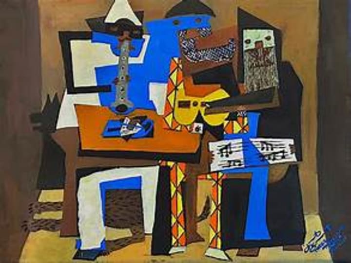 Three Musicians is part of the changes in Picasso’s artwork after 1914. He used Cubist techniques in the conventional medium of oil on canvas. This allowed the artist to create bigger and more colorful artworks. In the painting the harlequin is playing a guitar. Pierrot and Harlequin were standard figures from the ancient Italian comedy theater known as Commedia dell’Arte. This artwork is a collage created from cut-out pieces and colorful paper.