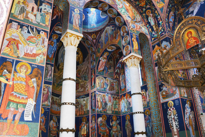 The impressive mosaics in the interior were made with millions of tiles made of Murano glass in more than 15,000 color shades. They were created by Russian artists based on frescoes copied from medieval monasteries across Serbia.