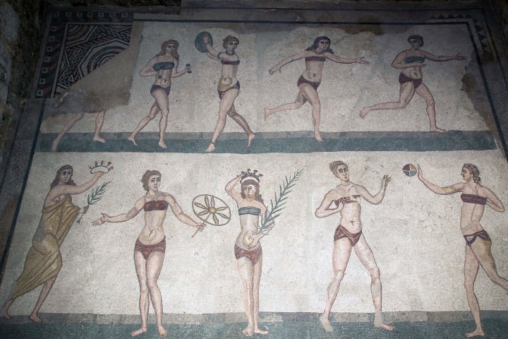 The most famous depicts bikini-clad women partaking in sports like weightlifting and discus throwing.
