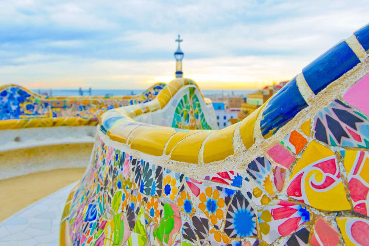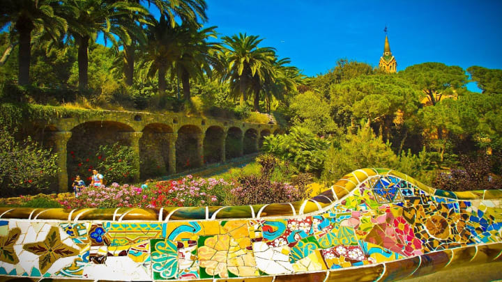 The park features sweeping walls, surreal benches, and mythical creatures, all covered in colorful mosaics. Parc Güell is a UNESCO World Heritage Site.