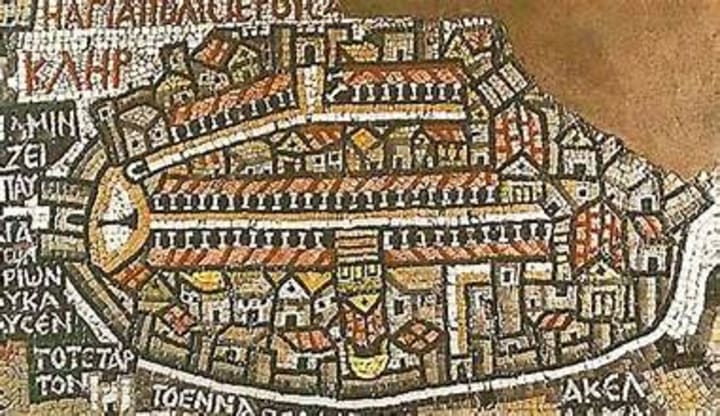 The map focuses on the city of Jerusalem and dates back to the 6th century. The Madaba Map was discovered when the new Greek Orthodox Church was built on the site in 1884.