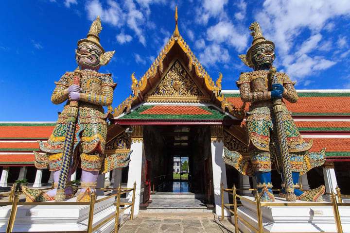 War Phra Kaew is the most scared Buddhist temple in Thailand. It is famous for its pavilions, prangs, and statues of mythological creatures decorated with glass and porcelain mosaics.