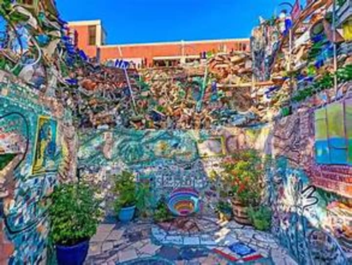 In Philadelphia famous South Street is renowned for its impressive, multi-colored street art. Street artists have transformed abandoned buildings into works of art. Local artist Isaiah Zager created a work of art with recyclable materials such as glass bottles. He reformed a storefront into a sculpture park with many colorful designs leading up staircase and along alleyways. His artwork is now protected by Magic Gardens, a non-profit organisation .