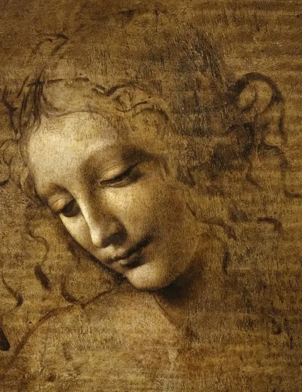 Like many of Leonardo’s portraits, the identity of the woman in La Scapigliata remains unknown. Some art historians speculate that she could have been a member of Leonardo’s circle or possibly a model for a larger, unfinished composition. Given the gentle, serene expression on her face, she may have been intended as a depiction of an idealized woman, perhaps a divine or symbolic figure.