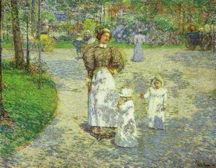Hassam is an artist from the late 19th and early 20th century. He focused his artwork on outdoor cityscapes. In his most notable one he depicts spring in the world-famous park in New York City, Central Park. The painting was completed in 1898 and depicts a mother with two daughters walking in the park.