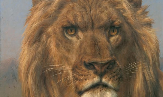 French artist Rosa Bonheur created a painting depicting a male lion, standing watchful and alert. The depiction of the lion is very realistic. Bonheur was known as a skillful animal painter and this is one of her most impressive artworks.