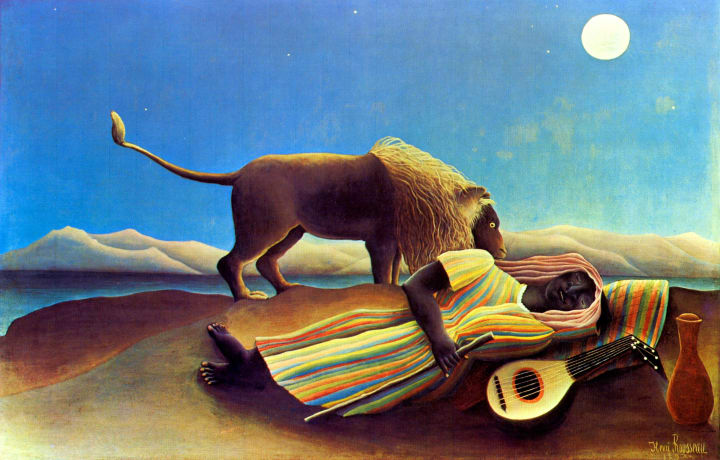 French artist Henri Rousseau was a self-taught painter. The painting depicts a sleeping woman in the desert with a lion standing by. The artwork has a dream-like quality showing the woman in exotic clothing and a mandolin nearby suggesting she might be a musician or traveler. The painting can be viewed at the Metropolitan Museum of Modern Art in New York City.