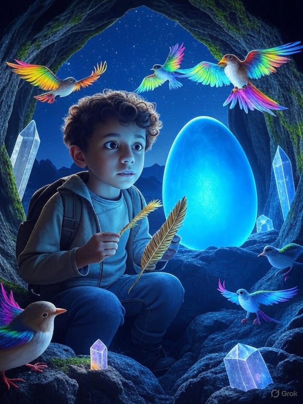 The birds vanished, and Yasser found himself outside the cave under a starlit sky. In his hand, he held a single glowing golden feather, a keepsake from his journey. He returned to his village with a story few believed, but the feather was his proof. From that day on, Yasser shared tales of the magical cave, inspiring others to seek adventure and beauty in the world.