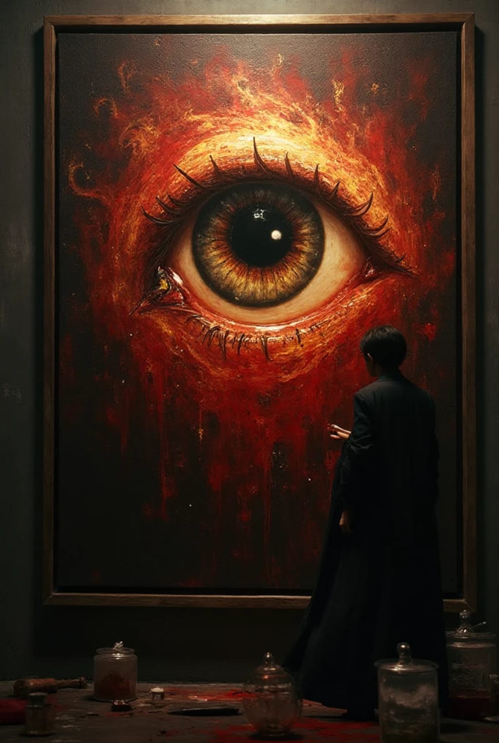 Mira stood before her canvas, brush trembling in her hand. The painting was nearly finished — a storm of crimson, gold, and black swirling into the shape of an eye. It stared back at her, accusing, alive.