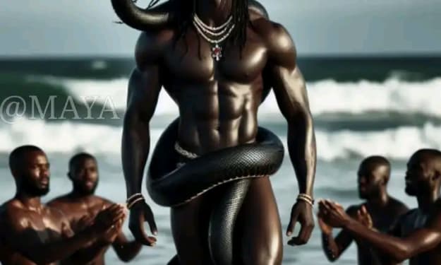 Suddenly,the echo of a raspy rumbling from the enraged sea came to me, a tremulousness to fear. The waves were really sloshing, slurping and slobbering with their salty lips,when a well built huge and dark skinned man emerged from the water. He had sheen curly black long hair dangling on his broad shoulders and a serpent curled on his neck. Then the eight young men knelt in the water to greet him as he gently approached towards me.