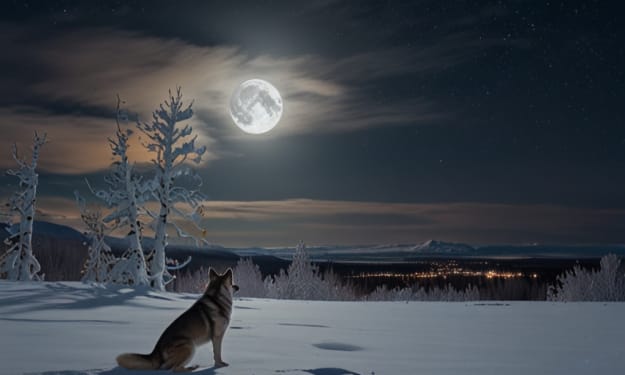 A full moon shines on the crusty snow. My footsteps crunch and crackle, but are drowned out by Huskies howling. This poem recollects my past years in Alaska, where hoar frost might cover the trees, and everyone had a dog, usually outside in a kennel or the yard, barking or howling, perhaps chained to a doghouse and sitting on top of it.