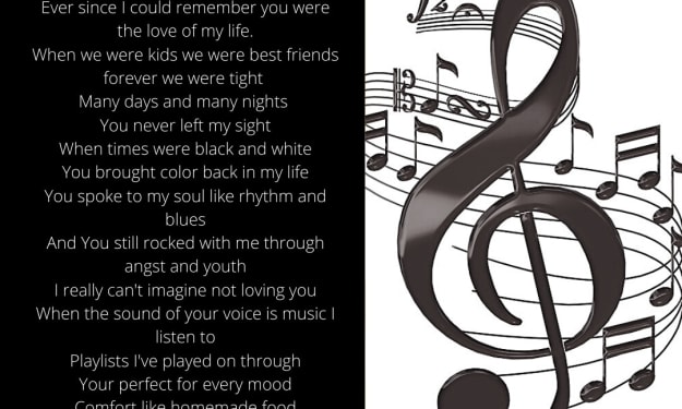 Ever since I could remember you were the love of my life. When we were kids we were best friends forever we were tight Many days and many nights You never left my sight When times were black and white You brought color back in my life You spoke to my soul like rhythm and blues And You still rocked with me through angst and youth I really can't imagine not loving you When the sound of your voice is music I listen to Playlists I've played on through Your perfect for every mood Comfort like homemade food At Grandma's Sunday at noon You're my sun and my moon I wake up and sleep with you You bring a theme to my life it makes all my days anew