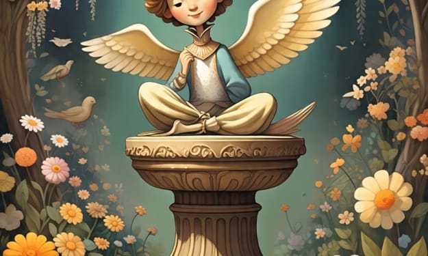 art writing... High above the city, on a tall column that reached toward the bluest stretch of the sky, stood the statue of the Happy Prince. He was gilded all over with fine, delicate leaves of gold, and for eyes, he had two bright sapphires that sparkled with kindness. At the hilt of his sword, there glowed a large ruby, red as a drop of fire caught in the light of day.