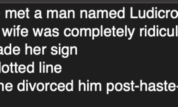 I once met a man named Ludicrous whose wife was completely ridiculous He made her sign on a dotted line and she divorced him post-haste-ious