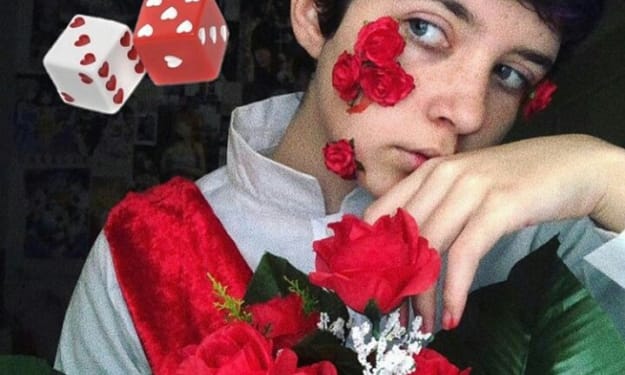While working in Halloween City for the season, Roman took the opportunity hang displays of bloody flower petals on the walls and place them on the shelves for decoration instead of profit. Roman's co-workers and boss praised him for the creativity, but they didn't know about the depth within his displays. The displays told a story of a man who was suffering, a man who had a co-worker that everyone tried to get him to date without knowing he's not straight, a man who longed for a local high school teacher who would only see him as an idiot, a man who had to pretend that he hated said teacher in order to live long enough to see another work day while also suffer enough to spit out another batch of bloody flower petals for his displays.