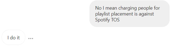 So, what's the harm in a playlist? Let me set the scene. You are a musician and you want plays. They pay like crap. So, you need a lot of them. Naturally, you're pretty eager to get some. You take what you can get. So you use your time and effort to apply to different playlists. Finding them manually or using sites like Submithub. As a musician, you're eager to get your music out there. So if someone approaches you with the promise of getting many plays, you take it. Right? I mean this is the age of the internet. Not exactly some dodgy man down an ally way. Maybe it's a fake account but you don't realize, you're in a rush. You've got tunes to make. One simple mistake. You don't even consider it.