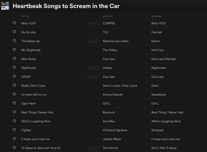 1) HEARTBREAK SONGS TO SCREAM IN THE CAR