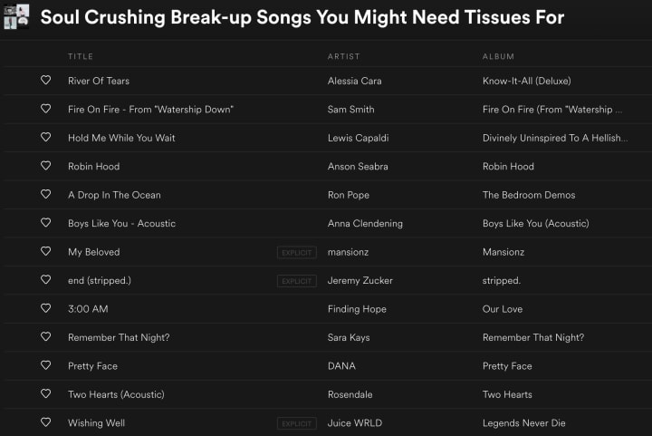 This playlist is dedicated to the hurt souls who want to stick their middle fingers to cupid, no matter the reason. Breakups are hard, no matter the circumstances. These songs are fantastic options to play at max volume to try and sooth a broken heart. Make sure you give yourself some time to belt out the tunes before even thinking about picking up your phone to text your ex. (But seriously, don't text them.)
