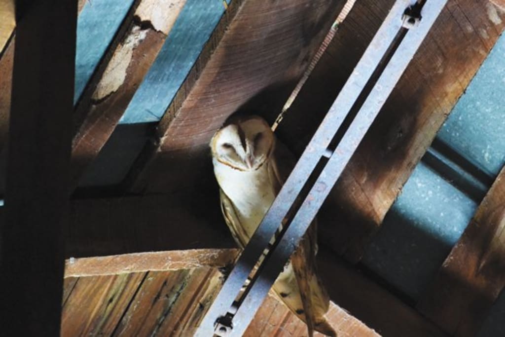 I was about to find my way out when I heard fluttering in the near distance. I turned around and saw a very haggard owl. I turned back around to continue my exit because I'm not a veterinarian when I heard;