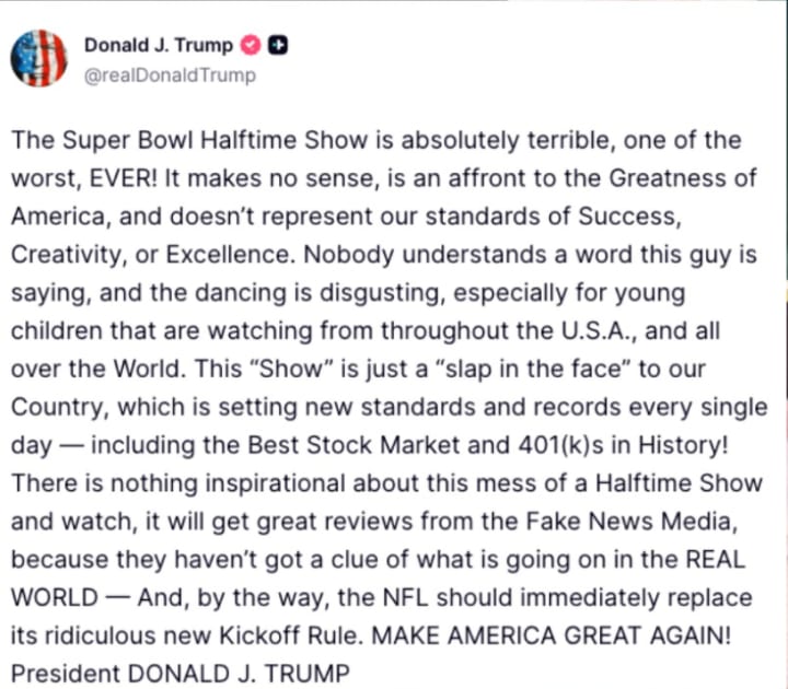 I LOVED the halftime show with Bad Bunny. I've never even heard of him before until the Grammys. And the bullet-point list of things you saw, I 100% saw the same. It was unique and brought their culture into full view. Trump will NEVER understand anything but his, self-centered, racists viewpoints. I don't consider him a leader at all. He is nothing but an, it to me. He's definitely not human.