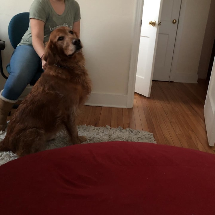Rick, Brennan's golden retriever and Young Avenue Sound Mascot, on one of his visits to the Virtuosity Agency office.