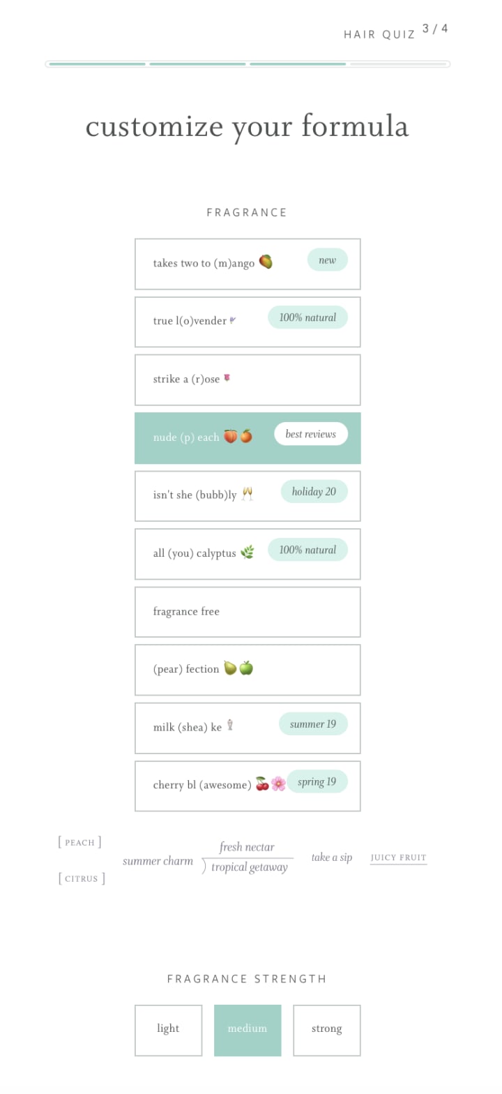 The first step is taking their super easy quiz to figure out your hair profile, then choose up to five hair goals you want, and finally pick your fragrance! You can pick the strength of your fragrance (or even opt for fragrance free), and choose from a lot of fun colours to mix and match your shampoo and conditioner.