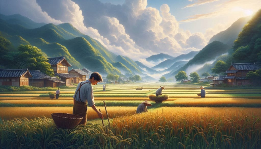 In the cozy, peaceful village of Mungyeong, South Korea, nestled in the mountains and extending down into bright green rice paddies, a young man named Jin was living with his family. Jin was quiet and did not talk much but always helped his father with work on the family farm. Behind the solidity of his work and a reserved exterior, this young man nourished a dream: he wanted to be a painter. His heart ached to share the beauty of the mountains, skies, and fields that bounded him, bringing these scenes into the pulsing colors of his imagination. Mungyeong was a traditional village, though-sons followed in the footsteps of their fathers, carrying on family lineages with pride. The father of Jin was a respectable farmer, and he fully anticipated his only son to take over the family land one day. "Our farm has supported this family for generations, Jin," his father often said. "There is no better way to serve than by working this land." While Jin deeply respects his father's commitment to their tradition, he knows his heart isn't in farming. It is in the quiet hours after dusk, on these hillside fields, that Jin secretly draws under the soft light of the moon. His canvas became his escape, where he could live and feel alive, breathed by expectations. But even he knew someday he would have to make a choice: to follow his passion or live his father's dreams for him.