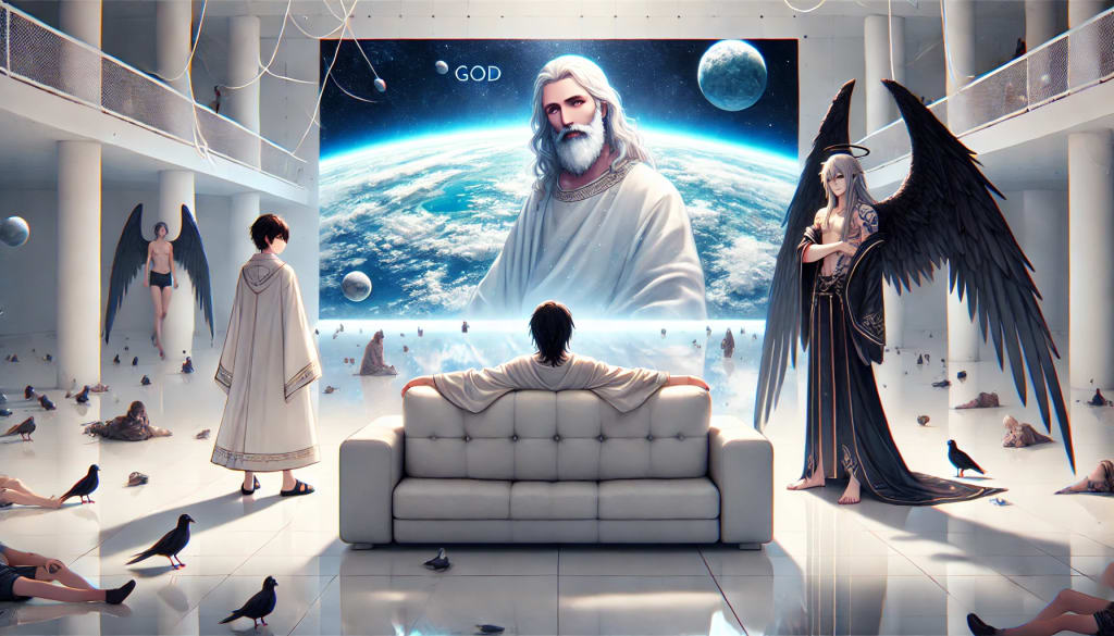 A mellow beat, like lofi music, floated through an endless white space. God lounged on a plush white couch, his gaze fixed on a massive screen before him. This screen displayed everything happening in the world below—every heartbeat, whisper, and life unfolding.