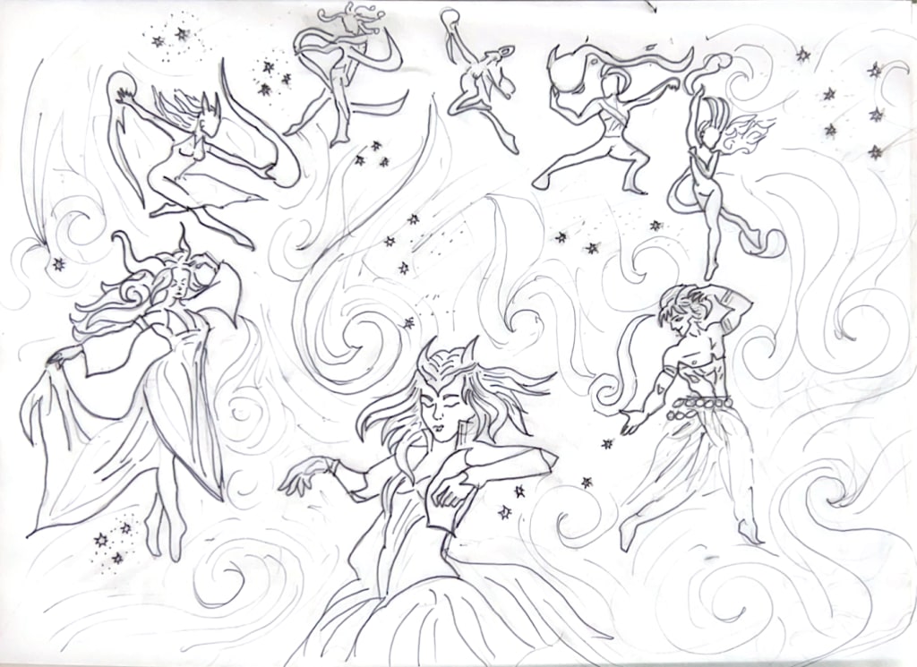 Avea found herself falling into the rhythm that she'd perfected with Dolunay. Swept into an orbit within the stars, her gown fanning outwards catching the specks of moondust at its hem, while some landed on her cheeks and shoulders glistening with delight. The weightlessness had taken over, and Avea found herself surrendering to the dance. Taking turns orbiting around all of the claimed, as though threading a needle between all of the celestial bodies. Every move precise and deliberate, never falling out of time with the beat of their chords.