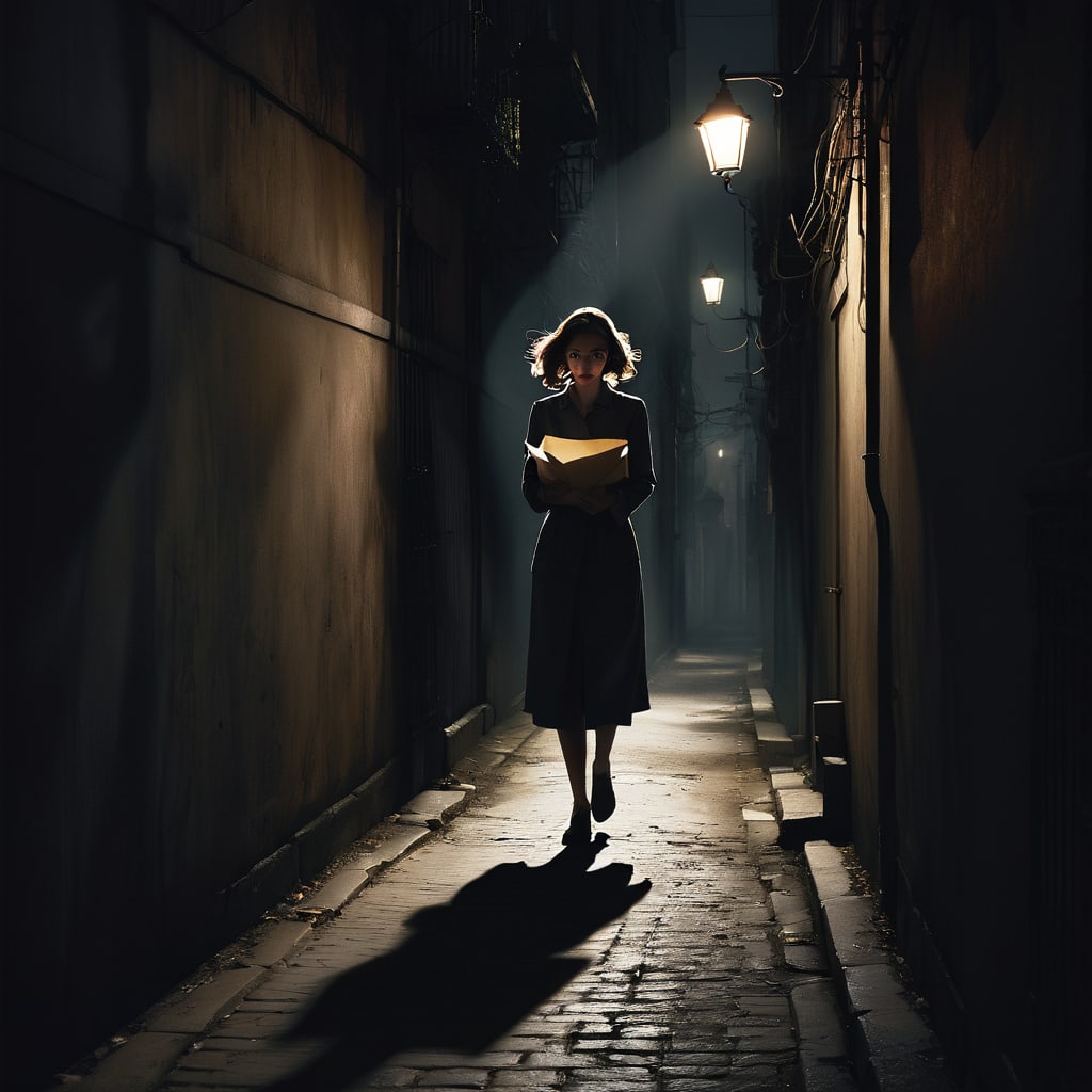 The night wrapped around the old town like a shroud, its darkness pierced only by the flickering streetlights. Sarah hurried down the deserted alley, her heart pounding with each step. She clutched the envelope tightly, its contents a secret that could unravel everything.