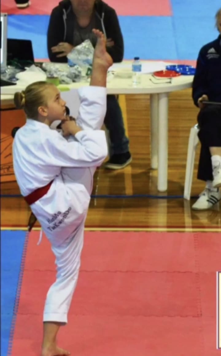 In November of 2014 I flew to Adelaide to compete at nationals for taekwondo. It was so exciting to go on the plane and wear the team uniform through the airports (it made me feel like a famous athlete!). On the day of the tournament I had one event which was an individual poomsae event in the 10-11 year old age group. The tournament was in the Adelaide velodrome which felt like the world's biggest stage walking in as an 11 year old. They called my division over the loud microphone to martial and to this exact day I remember seeing 15 competitors in my division from all over the country who also wanted what I had been training hard for non-stop all year. All that was going through my head was that I was just going to be another number getting judged today then forgotten about, there was no way I was going to place in the top 5 let alone place in the top 3 and get a medal for Victoria. Once they placed us in order of competitors I remember being towards the middle sitting in between a Queenslander and a girl from Western Australia. Being in the middle of the division also made me lose hope because I thought they'd just see me then they would still have to judge another 5 or 6 people which had the chance to see everyone and make sure they didn't make the same mistakes. Once everyone had finally competed their two poomsae I remember thinking to myself I have no hope right now in a division this large, it was the biggest division of the whole competition. The officials made us line up and they said a speech about the efforts everyone put in and how we should all be extremely proud of ourselves today. Then came the announcement of the results. This was so terrifying! I recall standing there with my head looking down at the floor because I was so nervous about what was to come next. They called out third place who was a girl from Victoria, then they called out second who was a girl from New South Wales at this point I thought I hadn't placed at Nationals which made me so sad to think about. My Dad was watching on from the stands among lots of other people also thinking what I was thinking, that I didn't place. Then came the big reveal for who had come first, who was the champion of the whole country going to be? My head was still looking down at the floor with my heart beating at over 100 miles per hour, then the official announced "and our national champion today, from Victoria Charlotte Doukas" it didn't even click in my head till I heard my last name and looked up and my jaw dropped and heart stopped and I saw everyone from my team jumping and screaming. I was the national champion of Australia and I had won the biggest division of the competition! That group ended up being called the group of death that is how challenging it was.