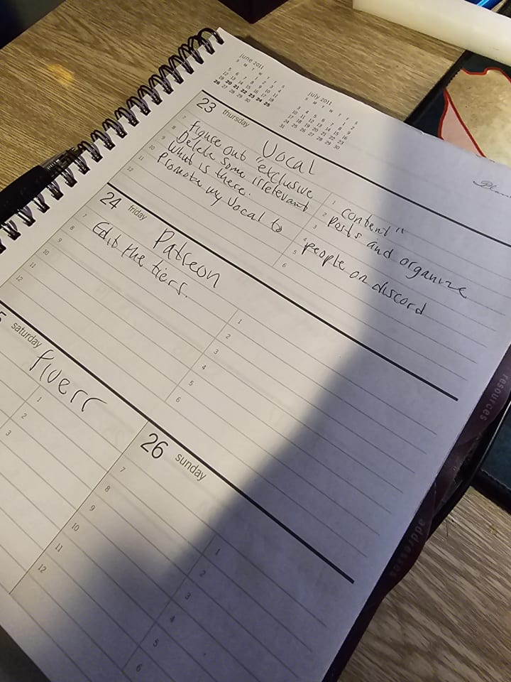 Each day was one Platform/Social Media/Project and the different hours of lines given for that day was the plans around it. That way I could maintain some work on something and not completely overwhelm myself. What ever doesn't fit on that day can be sent to another "day"