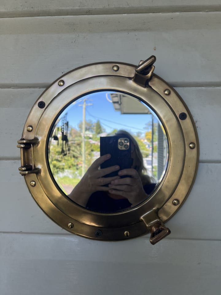 So happy! I finally found a 20cm mirror to fit my brass porthole. I had to carefully grind down the glass in two sections around the screw holes. (Arggh) and I lost the original tiny screws that screw down the plastic insert inside, so I had to cut 6 screws shorter with my bolt cutters. But I did it.