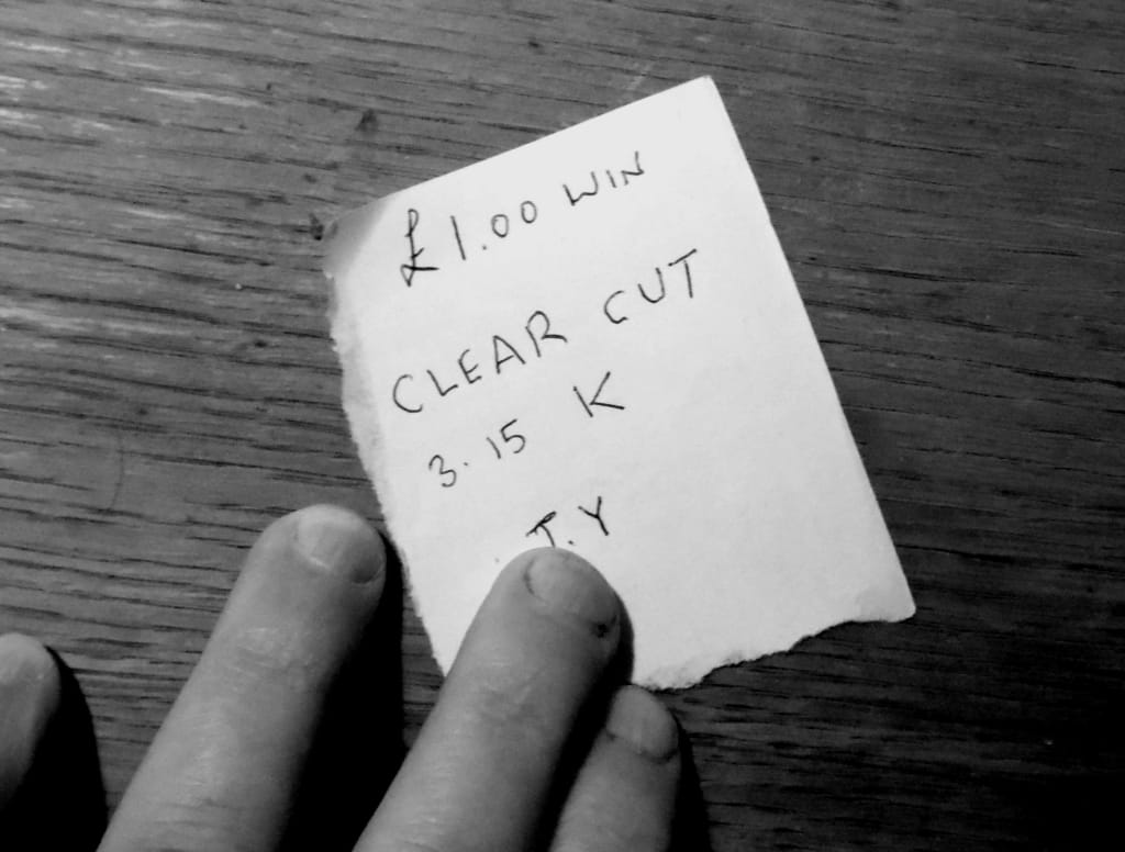 But when the day of the race came, my friends and I didn’t dare let Clear Cut pass us by, and I invested to the tune of a one pound note. The horse romped home by half a length, at a price of thirteen-to-two. We were delighted, and due to how uncannily accurate the letter’s prediction had been, convinced that horse racing was a rigged racket. As an aside, that same day I picked out a horse in another race called Bear’s Paw, again because I liked the name, and it came in for me at a sweet sixteen-to-one.