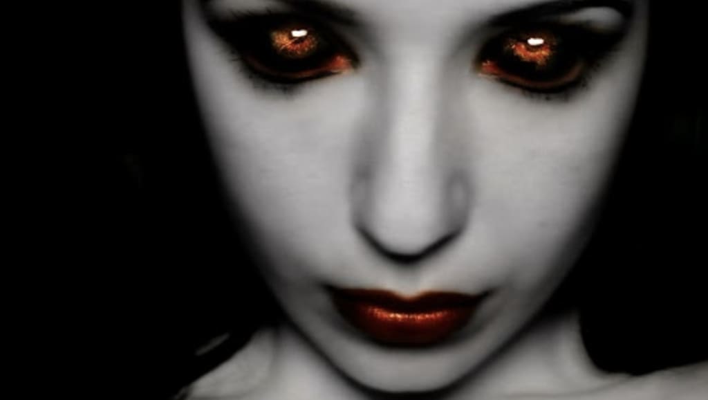 My blood ran cold and the only sound that escaped my mouth was a hoarse gasp. Her eyes pierced right through me; except they were smouldering red, like pools of blood.