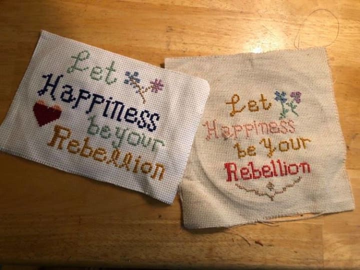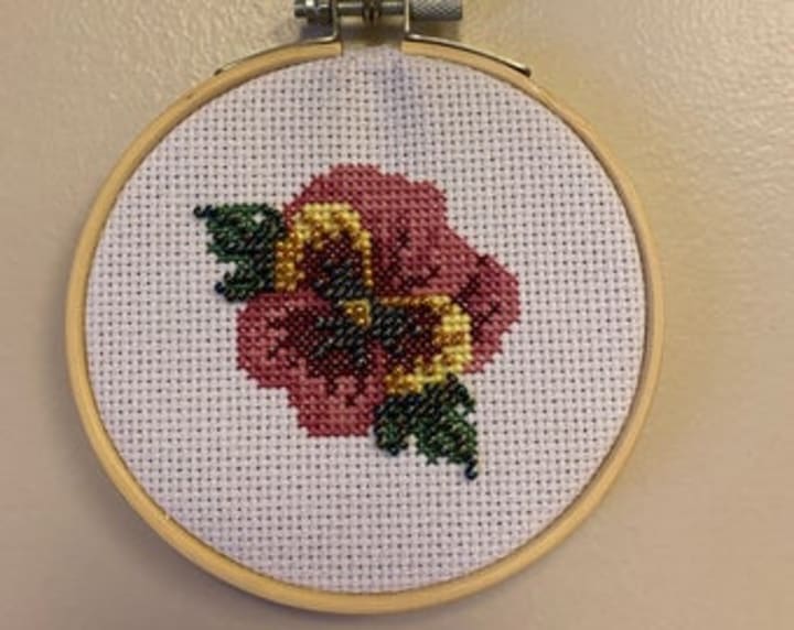 The first cross stitch I made as a child hangs on my grandmother’s kitchen sink window crossbar to this day. One singular red and yellow pansy, reminiscent of the ones we grew in our garden two thousand miles away from where my grandma lived. The pansy was held in a circular frame, made from one of those patterns with all the x’s pre-drawn on it for precision and learning. That’s when I’d still been green. Before I knew the x’s by heart.