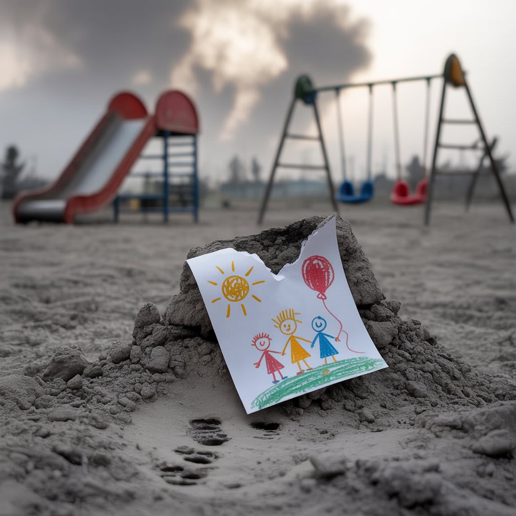 When the bombs hit, the sky turned black. The monkey bars collapsed. The slide twisted in on itself like a dying flame. And under a pile of rubble, between shattered tiles and a piece of a seesaw, someone found a crumpled sheet of paper—dusted in ash, edges torn.