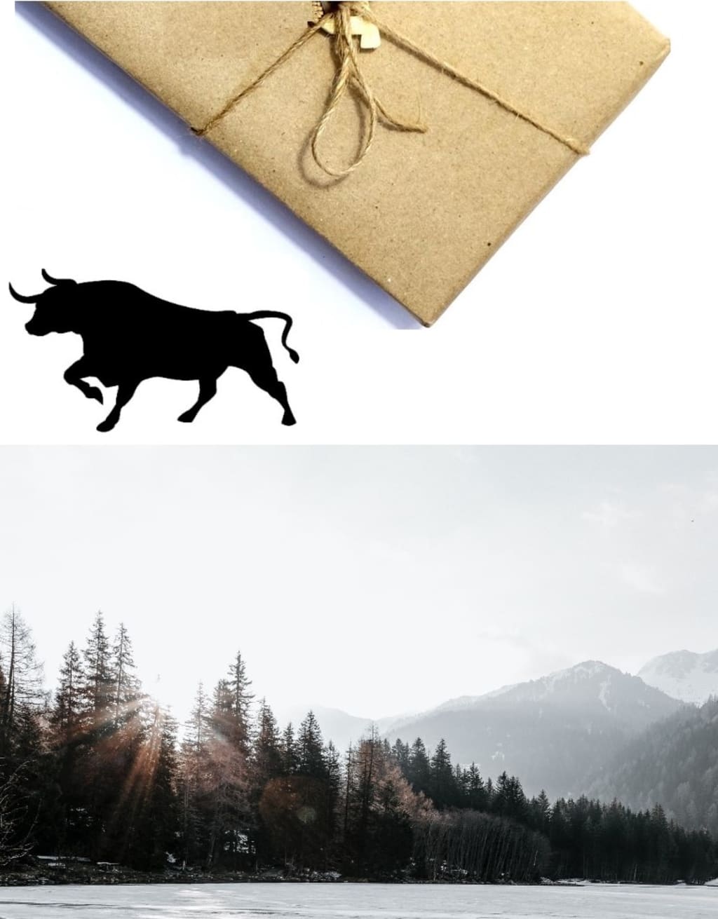 I looked to Evelyn as I touched the strings holding the package together. She nodded her assent. I unwrapped the paper revealing a lidded box. I lifted the lid. Inside were two things lying on the red cellophane, a picturesque photo of a frozen pond and a broken chrome bull ornament.