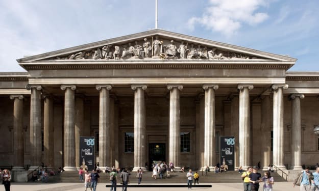 Just moments later, the broad steps of the British Museum splayed before them, and its trunk like pillars launched skyward to its white stoned character scene of ashen statues.