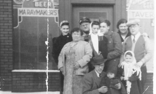 My grandfather’s story did however arise out of his personal experience during Prohibition. Imagine being the son of a weathered woman bar owner during that time! She’d lost two husbands when this photo was taken: One ran off and the other murdered. I think I have that right.