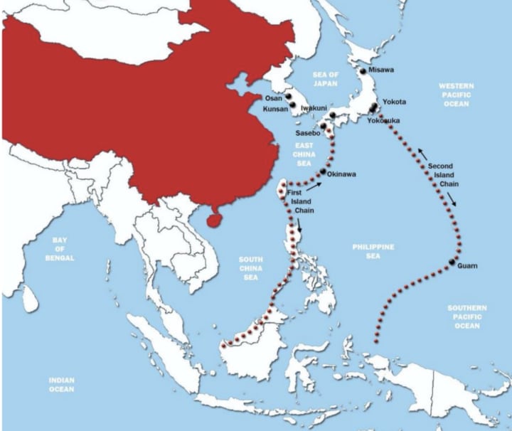 The first reason is related to the military. When the communists took over China in 1949, the US developed a first and second island chain of military bases. This is a strategy to prevent China from expanding to the east.